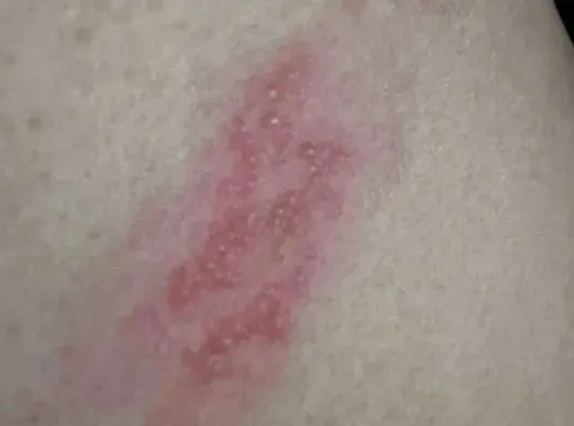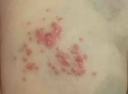 两三天后,患处皮肤出现潮红斑,随后出现成簇状分布而不融合的丘疹,继而变成水疱,水疱周围有红晕表现。水疱随后会干涸、结痂脱落,可能会有色素沉着。
