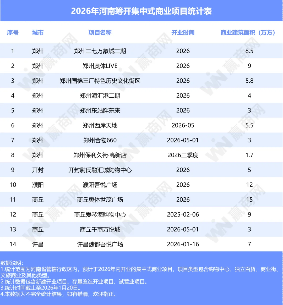2025年,河南热度攀升、强势出圈,商业体在郑州遍地开花,奥莱、胖东来、谷子经济等消费业态百花齐放。到了2026年全省筹开商业项目聚焦消费升级与场景创新,在政策引导与市场需求双重驱动下,形成以郑州为核心、地市多点开花的发展格局。据赢商网最新统计,河南2026年预计新增集中式商业项目14个,总商业面积91.5万㎡。对比2022至2026年近五年数据可见,自2023年河南新增商业项目在数量和体量迎来“双峰值”后,市场供应节奏逐步放缓。(文末附2026年河南筹开集中式商业项目盘点清单)- 从区域布局来看,省会郑州有8个新开项目,总建筑面积达40.5万㎡,数量创下近五年之最。二七商圈、奥体中心片区、郑东新区等板块成为开发热点,承担着高端消费与业态创新的引领作用;商丘、濮阳两地聚焦区域商业空白,通过大型综合体填补市场缺口;此外,开封也有中小型商业布局,推动城市商业均衡发展。