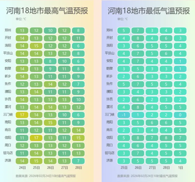 本周河南多雨雪大风,25日,全省有小雨、中西部和南部局部中雨,26日,南部有小雨,27日夜至3月1日,全省迎小到中雨,西部、西北部高海拔山区有雨夹雪或小到中雪。气温先稳后降,28日起受冷空气影响下滑,3月1日全省大部最高气温降至6℃~10℃。本周大风频繁,预计26日、27日和28日-3月1日大部地区风力3~4级,阵风6级左右。