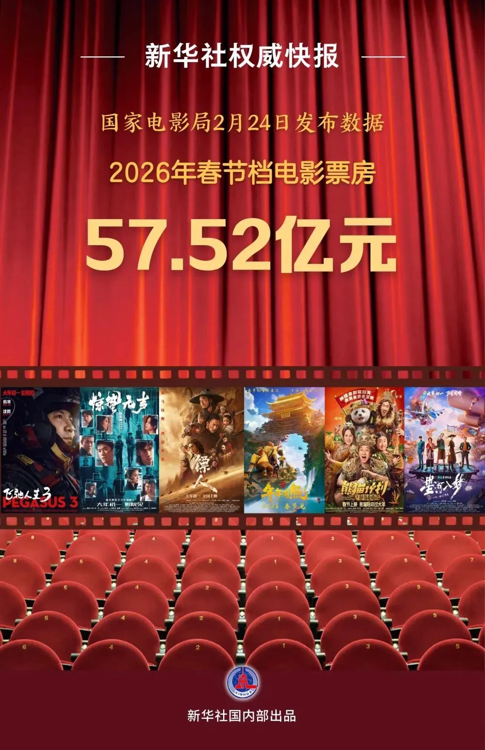 国家电影局2月24日发布数据,2026年春节档电影票房为57.52亿元,观影人次为1.20亿。猫眼专业版数据显示,河南省以3.44亿元的综合票房位列全国第五,郑州跻身城市票房第13位。