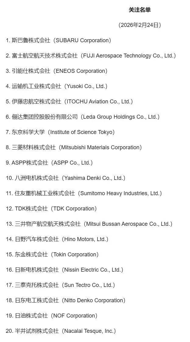 商务部今天发布2026年第12号公告,公布将20家日本实体列入关注名单。