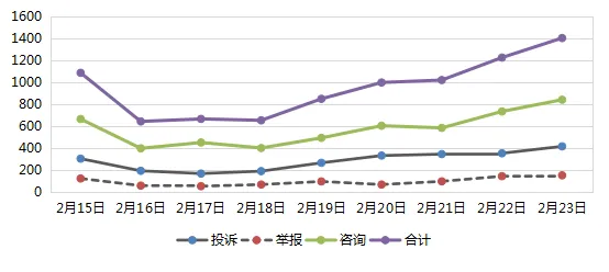 春节期间(2026年2月15日-2月23日),郑州市12315投诉举报维权中心,接到消费者投诉2540件、举报832件、咨询5144件,共计8516件。