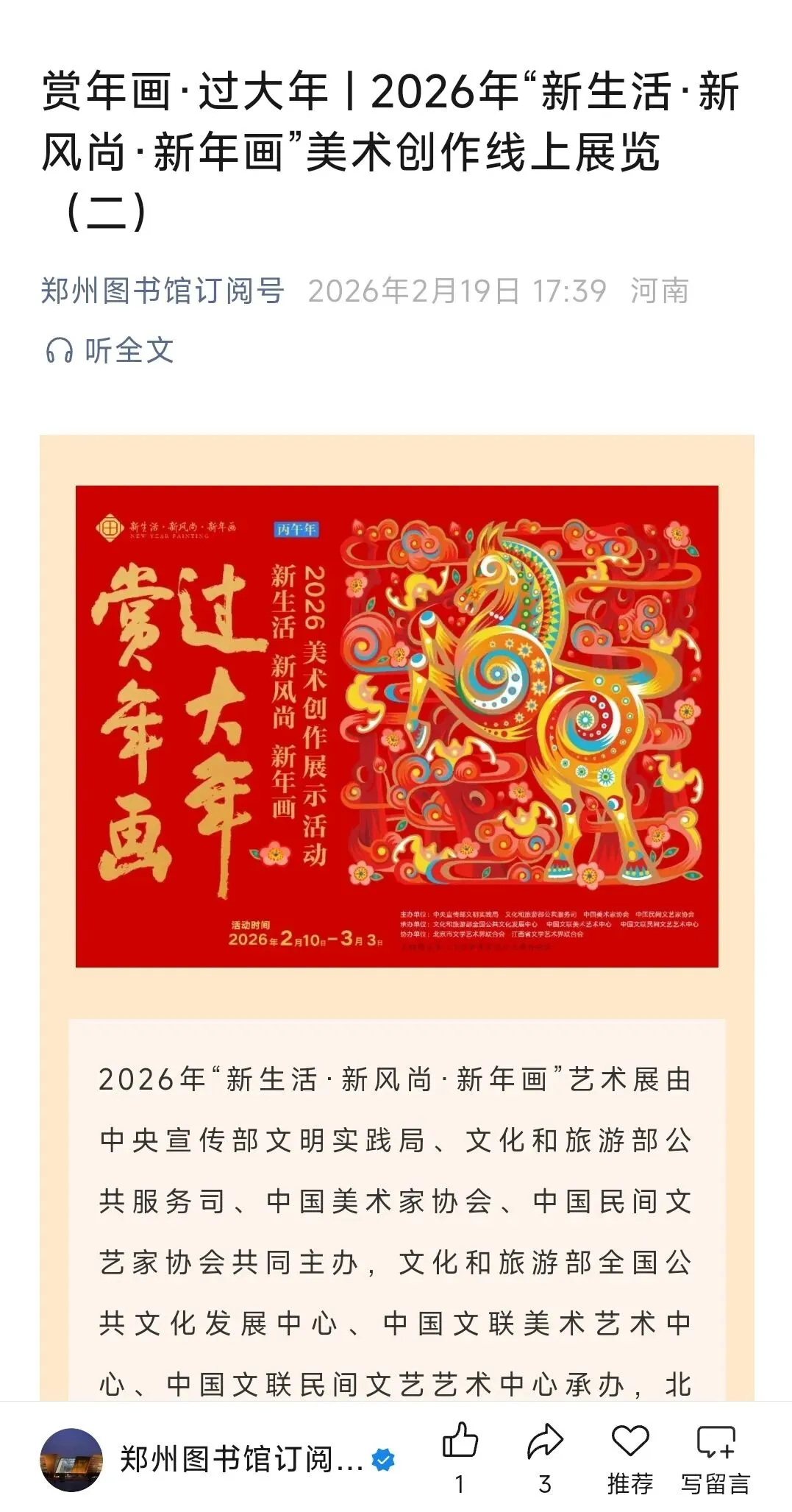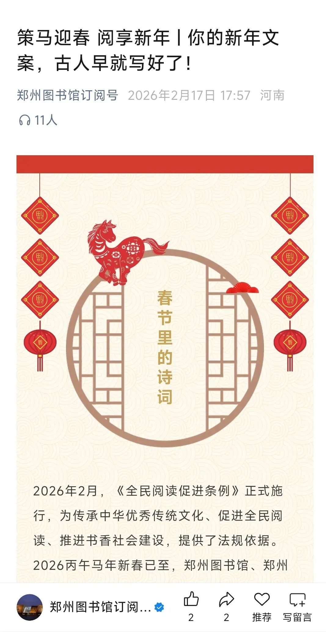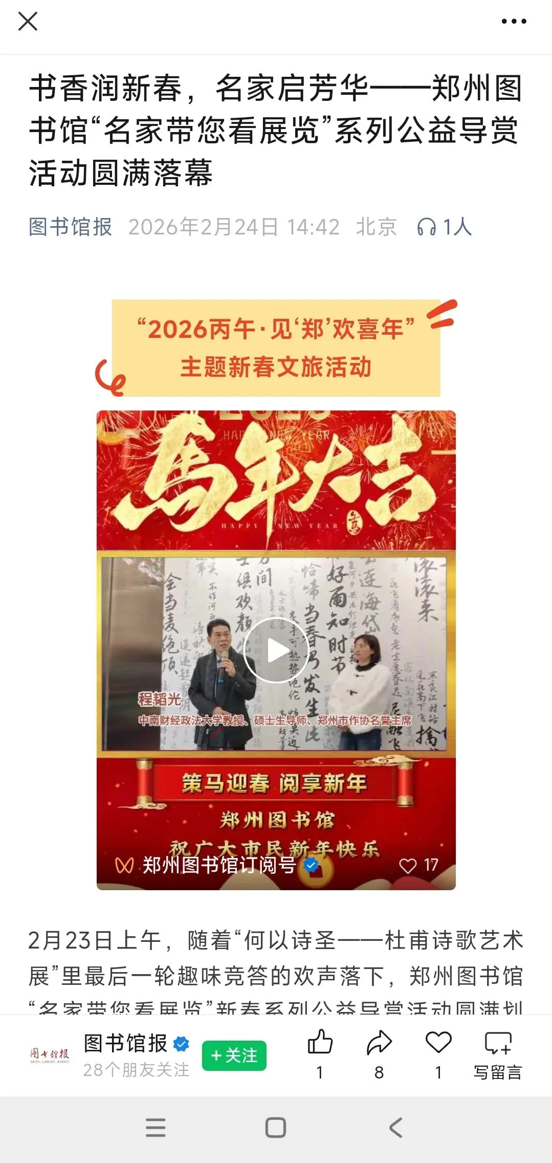 郑州图书馆2026年春节系列文化活动亮点突出、氛围浓厚,获得社会广泛关注与好评,先后被《图书馆报》《郑州日报》等多家权威媒体宣传报道,进一步扩大了城市文化影响力,让书香年味传遍全城。