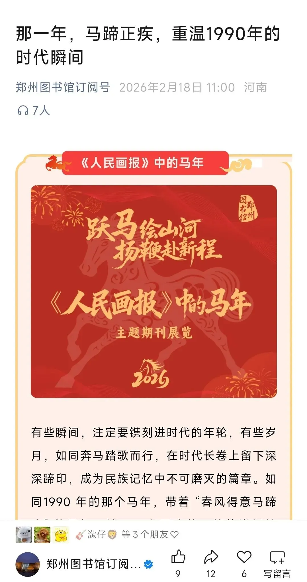 线上聆听名家讲座,徜徉古籍诗词之美,以文字与声音传递传统韵味;翻阅《人民画报》里的马年记忆,在馆藏文献中回望时代变迁、感受岁月印记。同步上线“赏年画・过大年”云展览,集中呈现精彩非遗年画作品,让读者足不出户便能沉浸在浓郁的民俗文化海洋之中。
