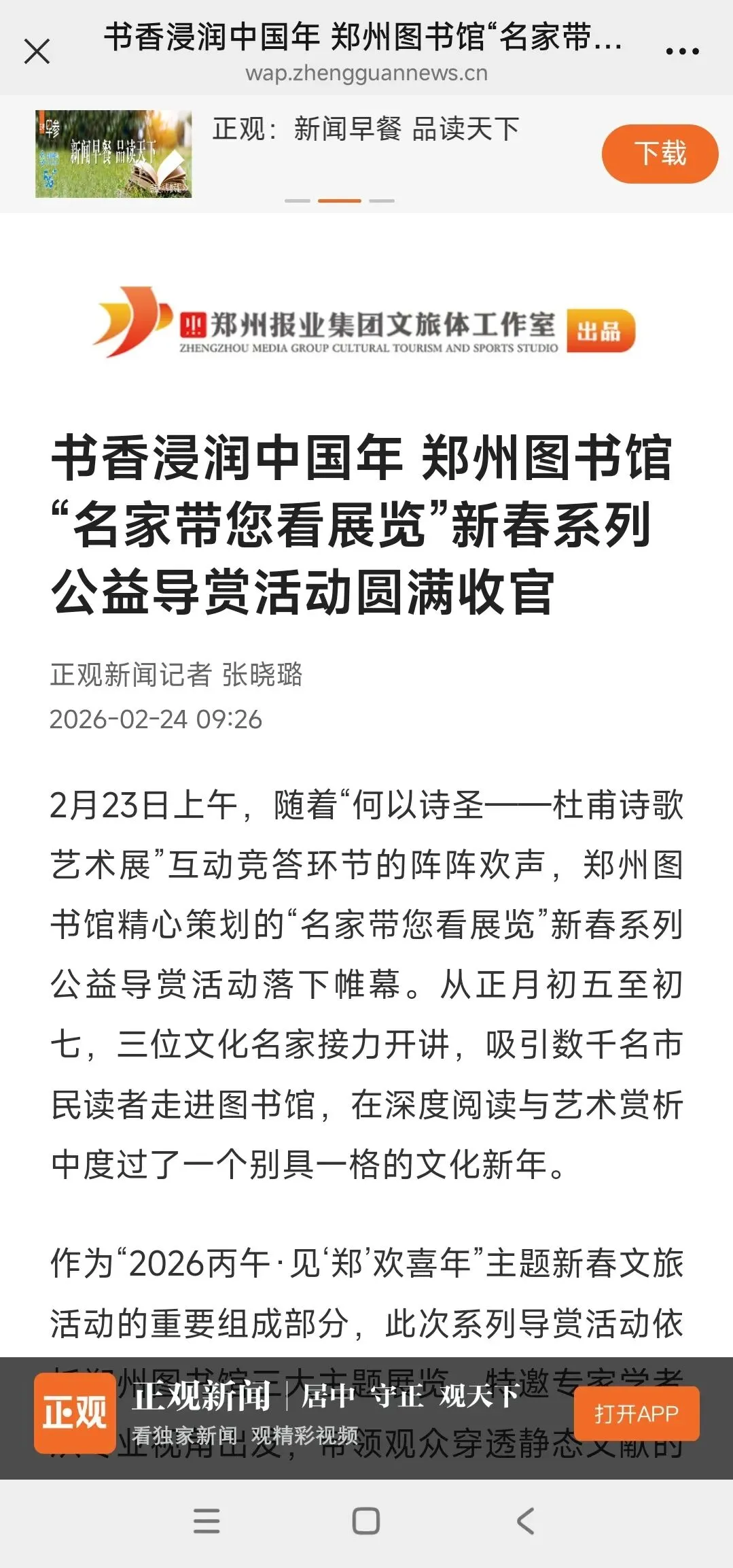 作为“2026丙午・见‘郑’欢喜年”主题新春文旅活动的重要组成部分,郑州图书馆“名家带您看展览”春节正式上线。