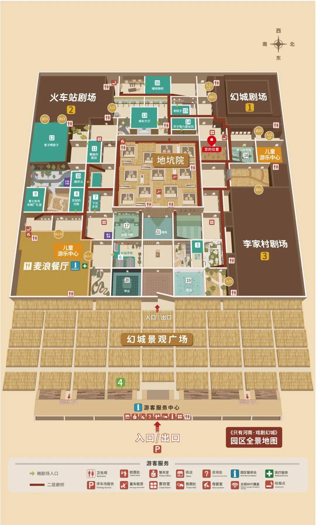 整座戏剧幻城大体上是一个九宫格,四个角是三座主剧场和餐厅,中间的地坑院也是逛吃的地方😎,其余十几个小剧场分布在其它的方格内。