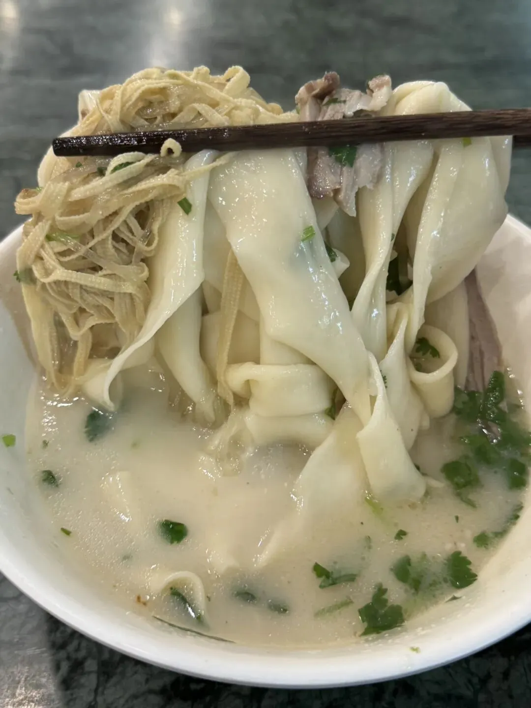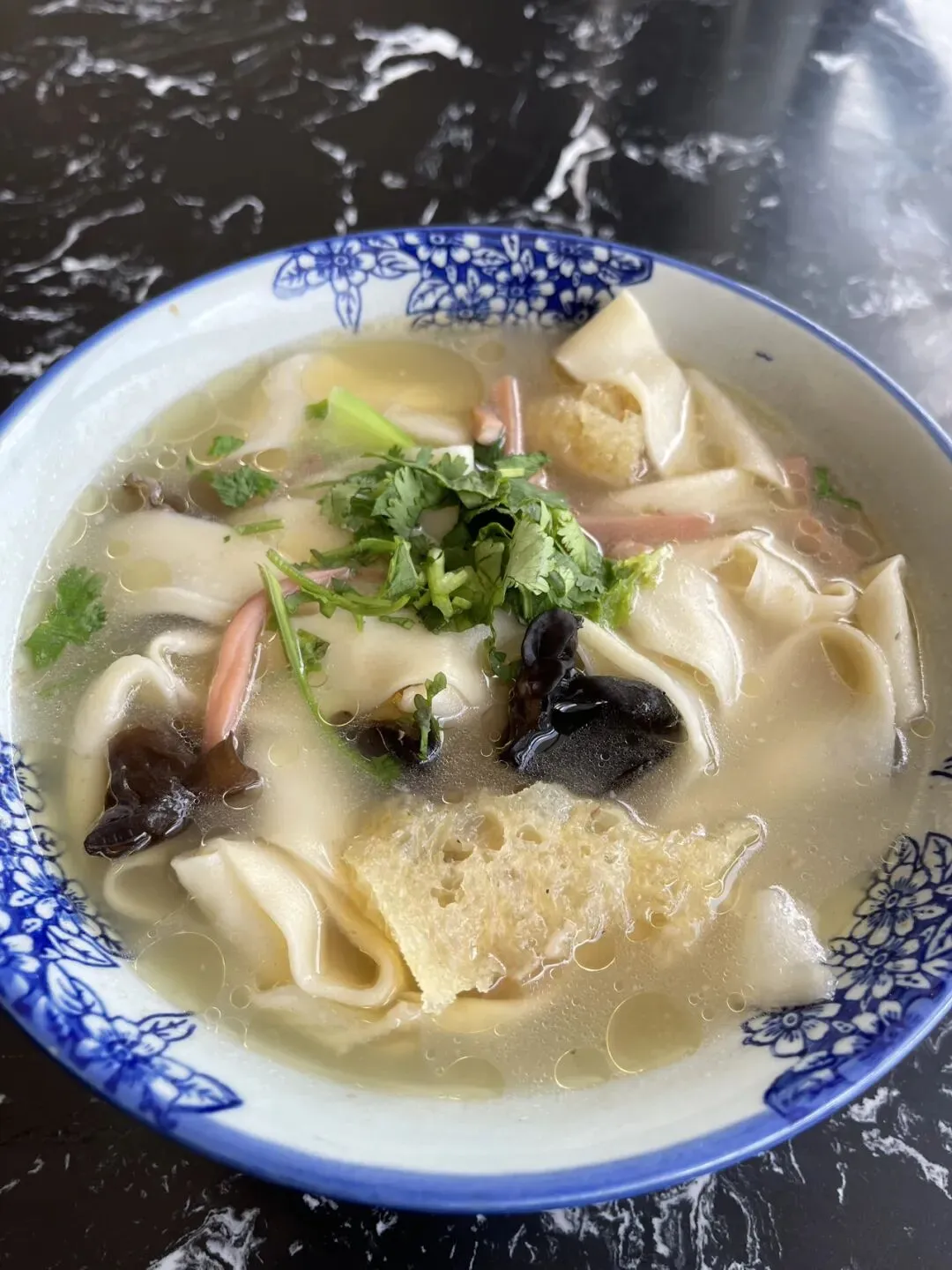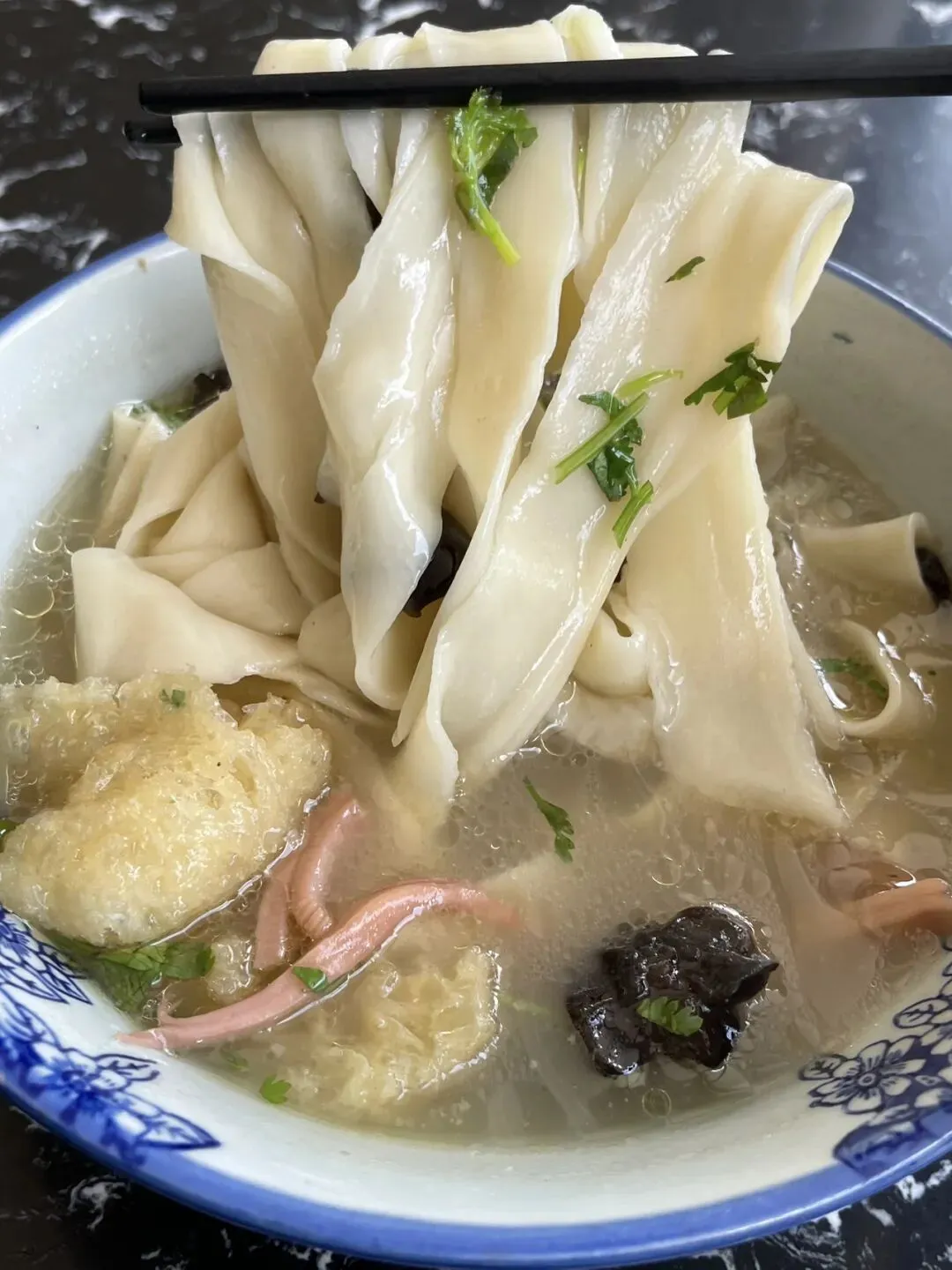 烩面用的是一种宽而薄的面片,拉扯后下锅,口感爽滑柔韧有嚼劲,烩面的经典配菜包括羊肉片、黄花菜、木耳、豆腐丝、粉丝等。