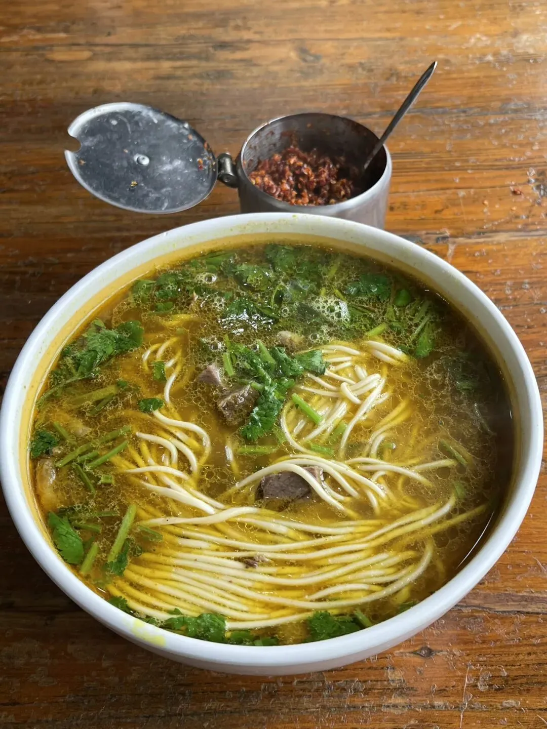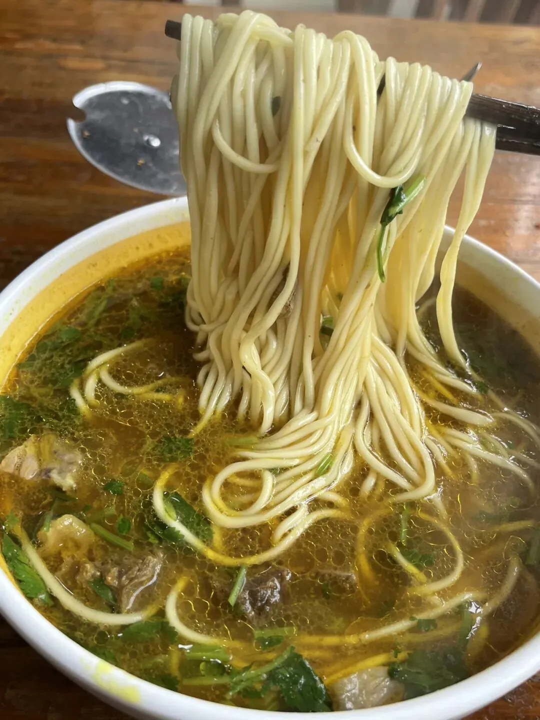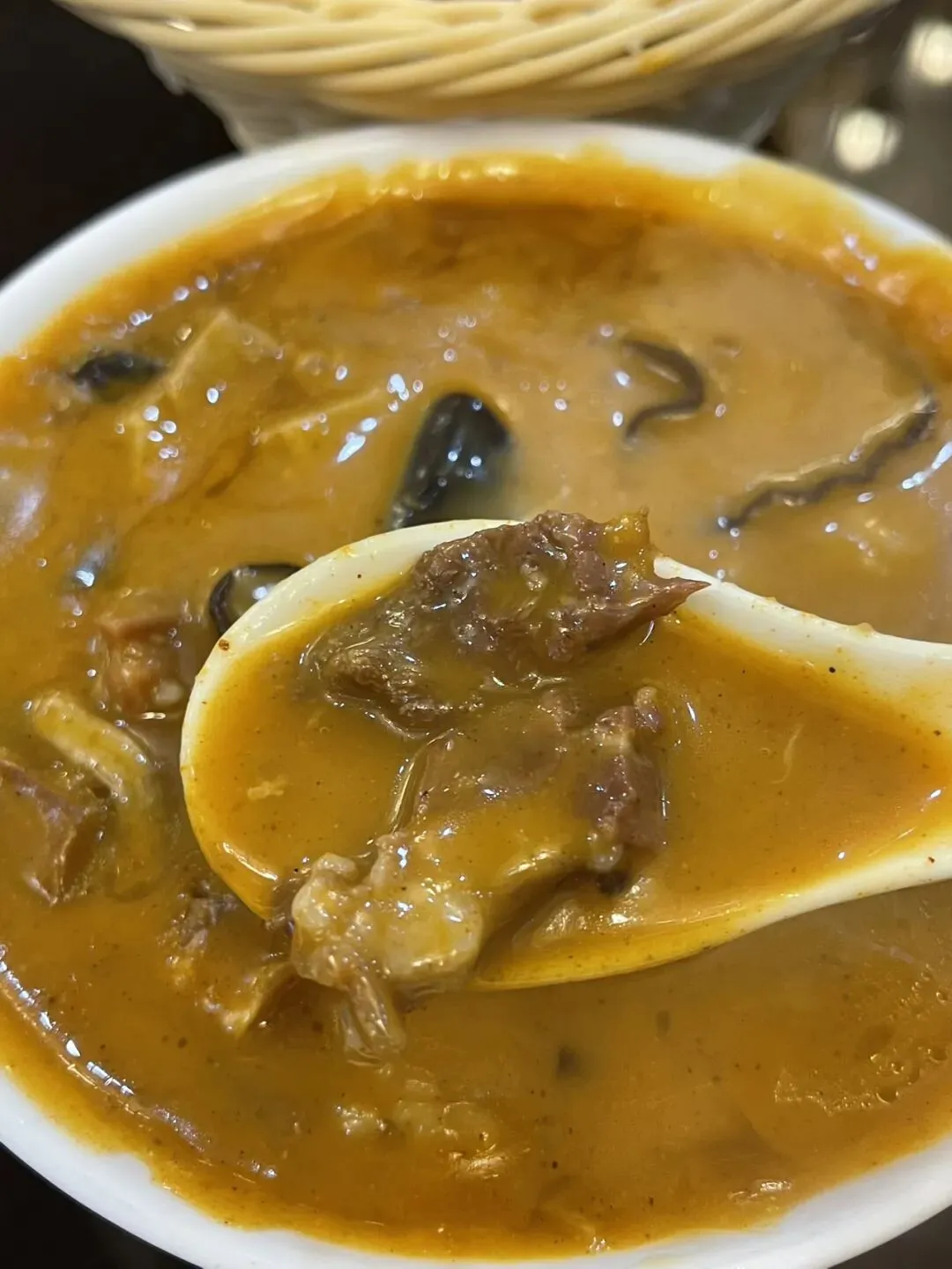 郑州咖喱拉面与天津和沧州等地的黄汤拉面类似,但更精致一些,咖喱味特别浓郁,比四厂烩面要浓的多,以至于喝上一口黄汤,回味有些发苦。