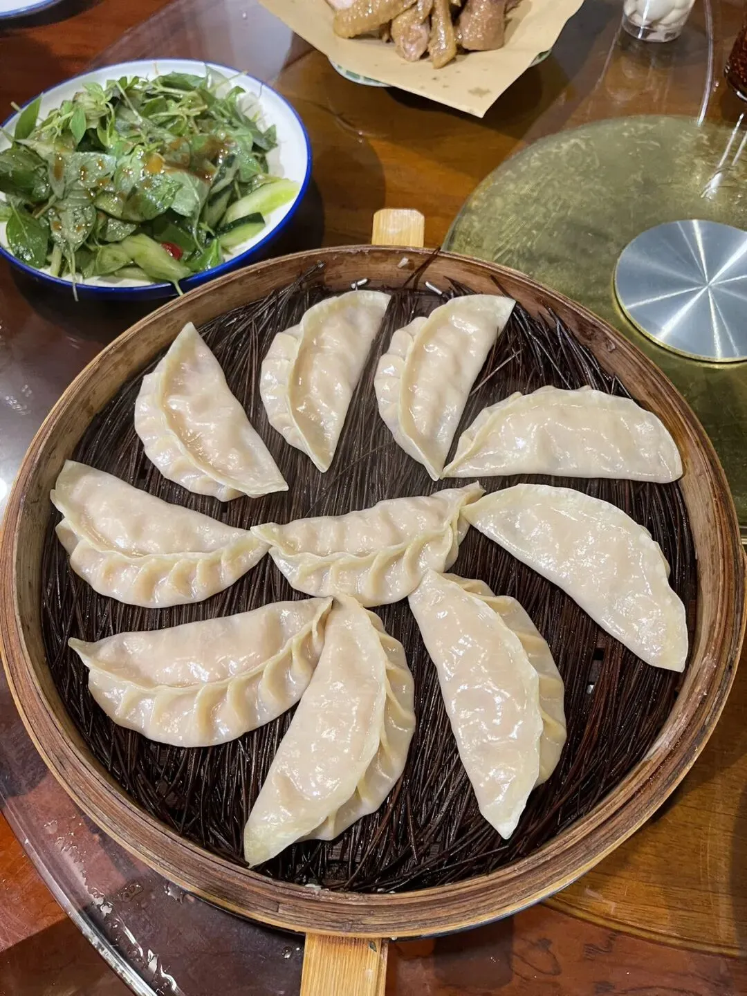 郑州传统小吃有老三记:合记烩面、葛记焖饼和蔡记蒸饺。现在郑州有“老蔡记蒸饺”和“京都老蔡记蒸饺”,据说老蔡记是国有的,京都老蔡记是原来老板的后人开的,与西安樊记肉夹馍和樊家肉夹馍的关系差不多。砍柴书生在郑州烤鸭店和“京都老蔡记”都吃过蒸饺,饺子漂亮,皮薄馅大,口感香嫩,确实是用心做了,要比普通的蒸饺好吃许多。