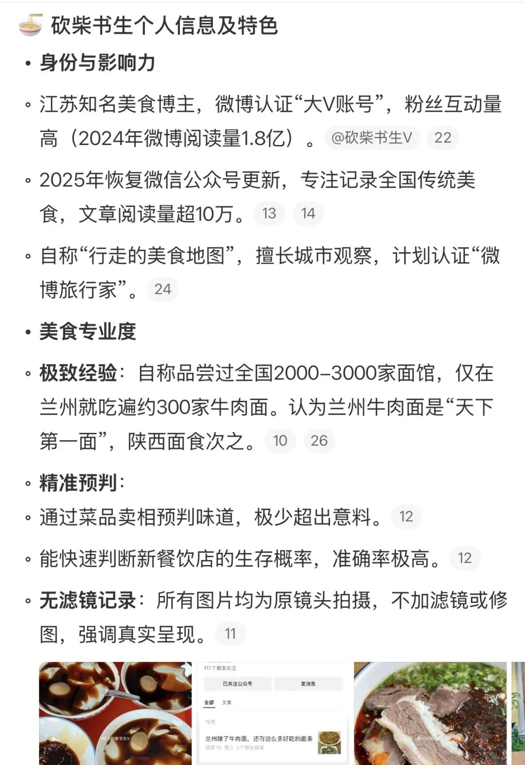 砍柴书生花了10年时间,在全国各个城市寻觅美食,人称“行走的美食地图”,下图是AI生成的砍柴书生网络资料,比砍柴书生本人还了解“砍柴书生”。