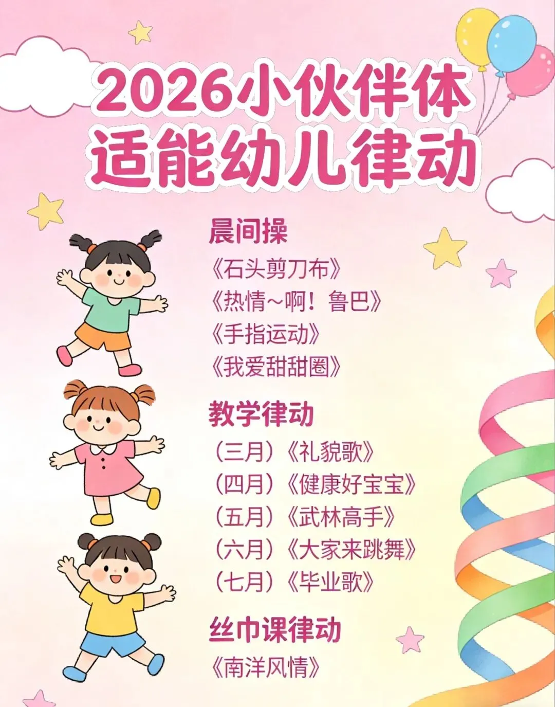 • 月度教学律动精准适配:三月《礼貌歌》、四月《健康好宝宝》、五月《武林高手》、六月《大家来跳舞》、七月《毕业歌》,贴合幼儿成长节奏,在律动中培养规则意识、协作能力与表达自信。