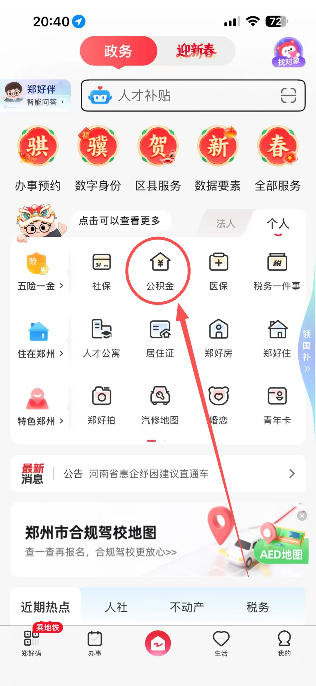 进入郑好办APP,在首页【公积金】版块,即可获取公积金线上提取入口。