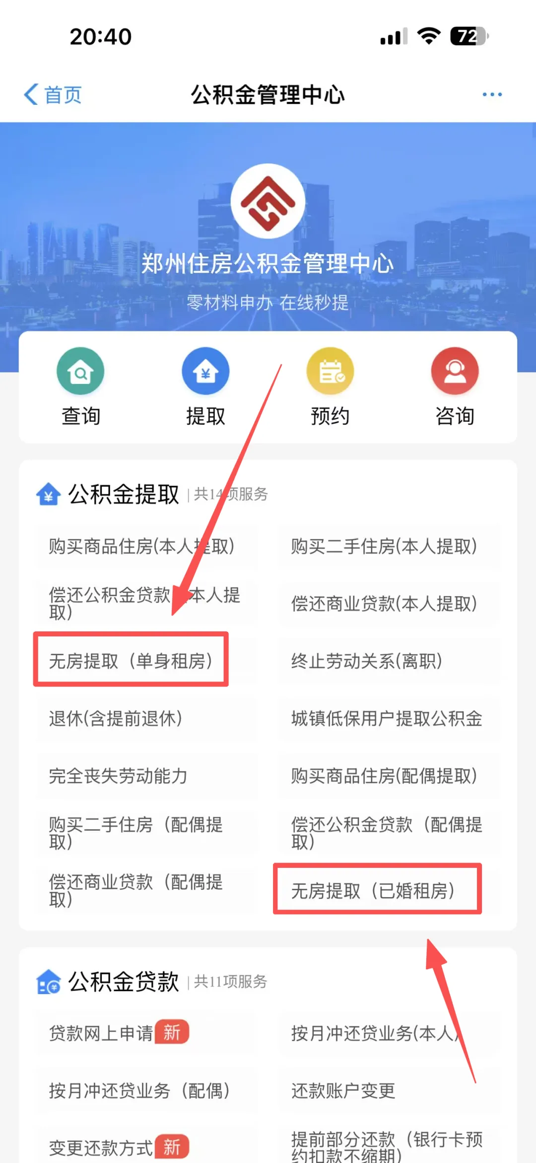1️⃣进入郑好办APP,点击选择“公积金”选项,进入后根据个人情况可选择“无房提取(单身租房)”或“无房提取(已婚租房)”