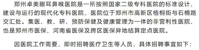 郑州卓美眼耳鼻喉医院是郑州市高新区一家集医疗、教学、科研于一体的大型非营利性二级专科医院。医院以“追求卓越,创造完美”为宗旨,致力于为患者提供高品质的医疗服务。