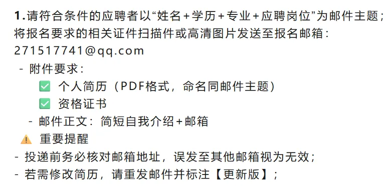 ①、应聘人员需保证所填邮件能够正常使用,我们将以邮件的形式通知面试时间地点;