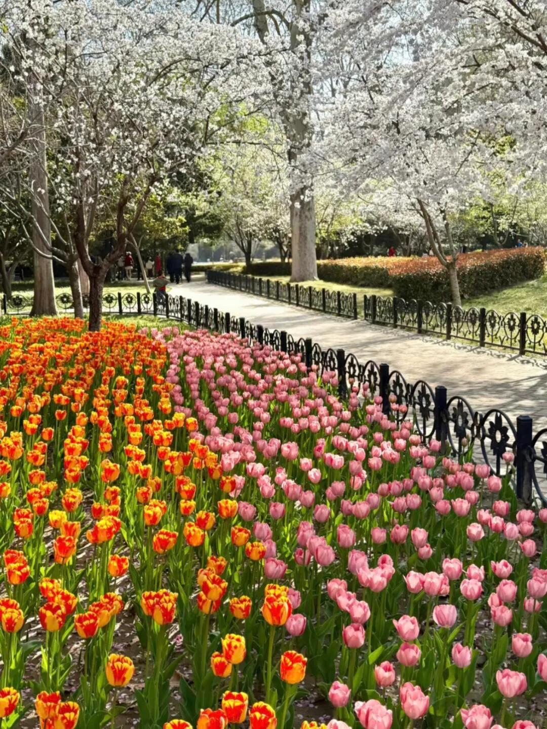 除了樱花,人民公园的郁金香也不容错过。五彩斑斓的郁金香花圃,红的、黄的、粉的、紫的,错落有致地绽放,比油画还要惊艳,是春日限定的治愈美景