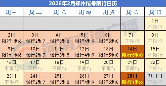 ⭐郑州车主们注意,2月28日本周六因调休限行尾号有变化,限行尾号为:1和6。详情>>