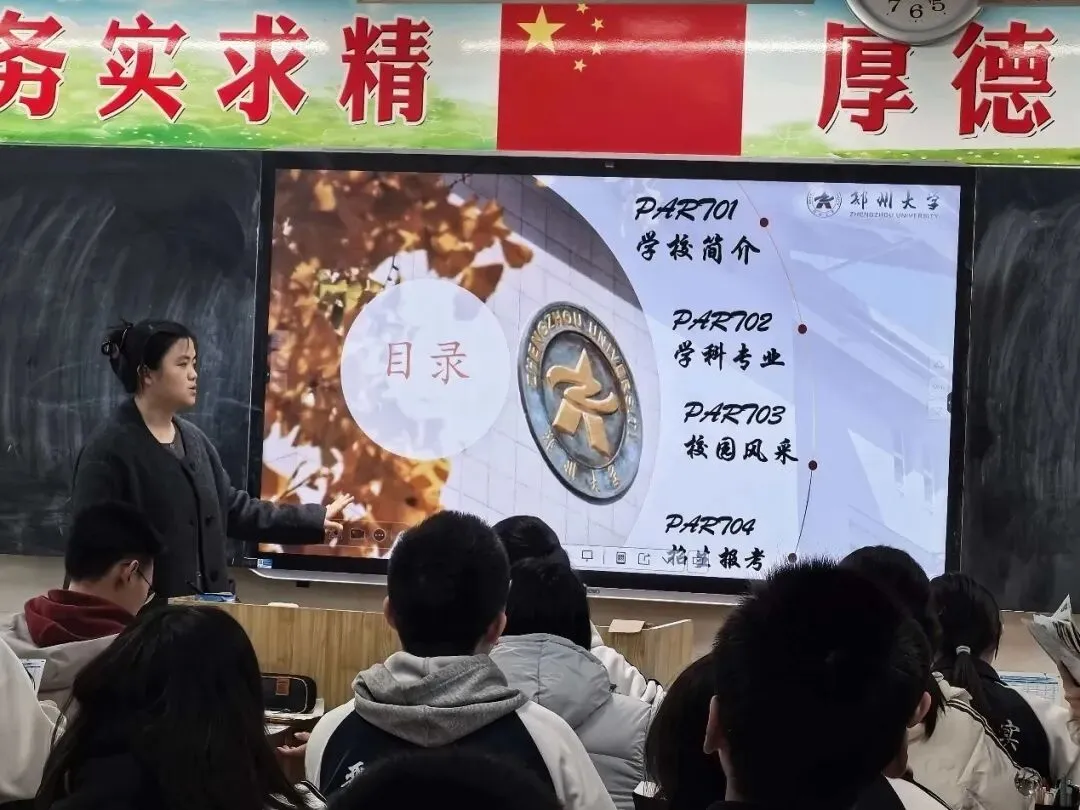 1月26日,郑州大学优秀学子回到河南省滑县实验学校,开展寒假返校宣讲活动,以亲身经历为学弟学妹点亮升学之路、传递备考力量。宣讲现场,我们围绕郑大办学特色、学科优势、校园生活、奖助体系等内容展开分享,用鲜活案例展现大学风貌与成长可能。结合高中学习与高考备考,我们细致讲解时间管理、学科提分、心态调适等实用方法,耐心解答志愿填报、专业选择、学习规划等疑问,现场互动热烈、氛围浓厚。从母校书桌到郑大校园,不变的是逐梦初心;从青涩学子到青春榜样,传递的是奋进力量。此次宣讲,既搭建了高校与高中的沟通桥梁,也激励滑县实验学校学子坚定目标、踏实前行。愿同学们以榜样为灯,不负韶华、奋力冲刺,在盛夏收获理想成绩,九月奔赴更好的未来!