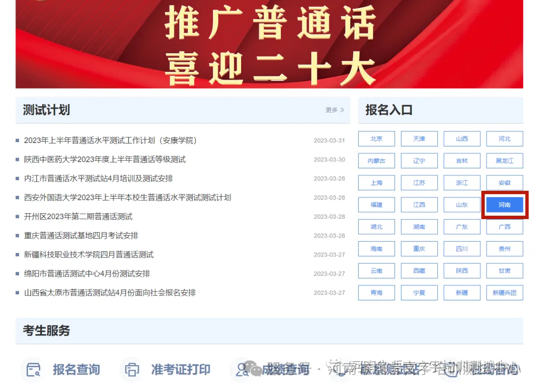 中心声明:河南省语言文字工作信息网是河南省语言文字工作委员会办公室唯一官方网站。河南省语言文字培训测试中心(微信公众号)是河南省发布普通话报名、测试、成绩查询等相关信息的官方渠道,请勿相信不明网站的宣传。网报所有测试名额均向社会开放,报名成功后直接通过在线报名系统国家普通话水平测试在线报名系统报名缴费。本中心未与任何社会培训机构、中介机构或其他营利性机构或组织,合作开展培训、代理报名、内部报名等工作,出现对话框提示“加好友”才能继续报名或被告知“必须通过某机构才能报名”等类似信息均为虚假信息。请考生注意个人信息和财产安全,切勿相信任何机构“代报”“包过”等宣传,预报名考生在报名、缴费等各环节增强安全防范意识,谨防上当,诚信应试。