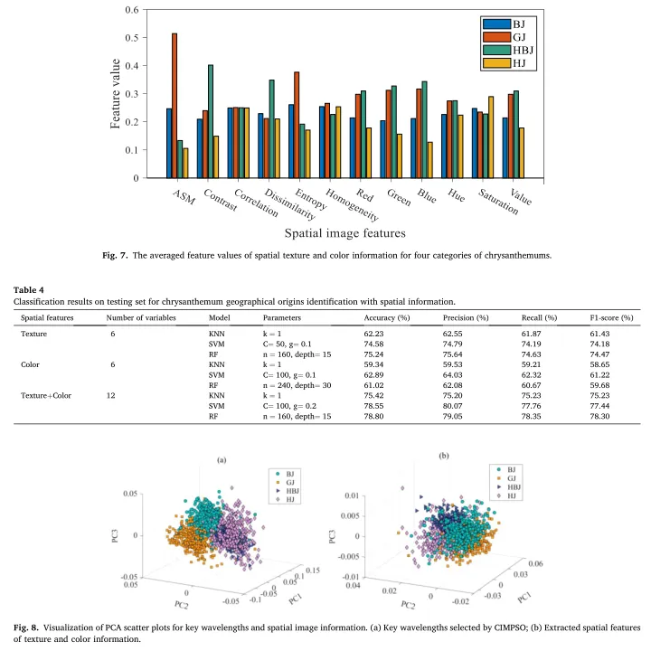 2、首次将空间特征(灰度共生矩阵纹理特征和 RGB/HSV颜色特征)与光谱特征融合,丰富了菊花产地鉴别的特征维度,提升了模型泛化能力。