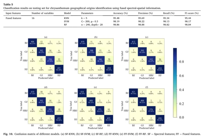 4、融合空 - 谱特征的随机森林模型达到 98.86% 的产地鉴别准确率和 98.84% 的 F1 分数,实现菊花产地的高精度、无损、快速鉴别。