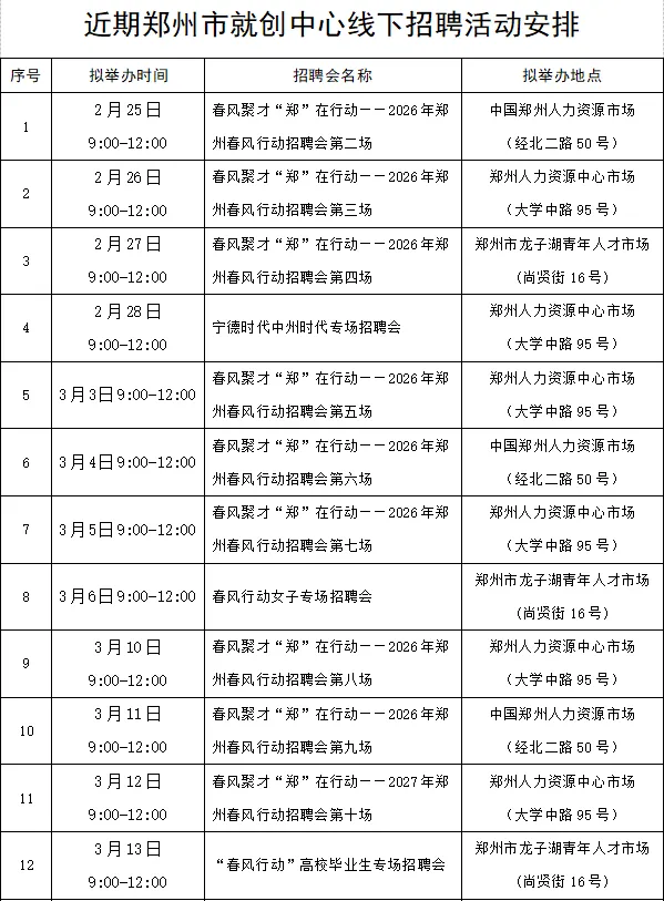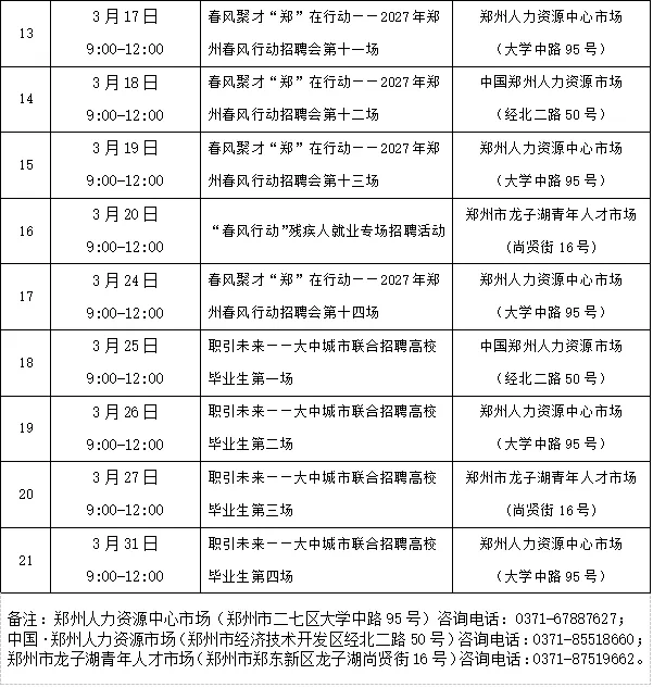 即日起至3月底,郑州市就业创业服务中心将集中开展21场线下招聘活动,活动采用“线上+线下”同步推进的方式,搭建全覆盖、高效率的招聘对接平台。