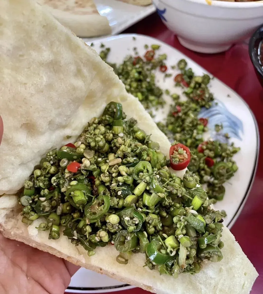 我是第一次让郑州的朋友带着去巩义一个饭店吃了一次炒花椒,我还是真的第一次听说花椒还可以用烧饼夹着吃,吃起来口味没有想象中的那么浮夸,有多少人吃过这道菜,当地人说这是他们这里的特色菜必点的。