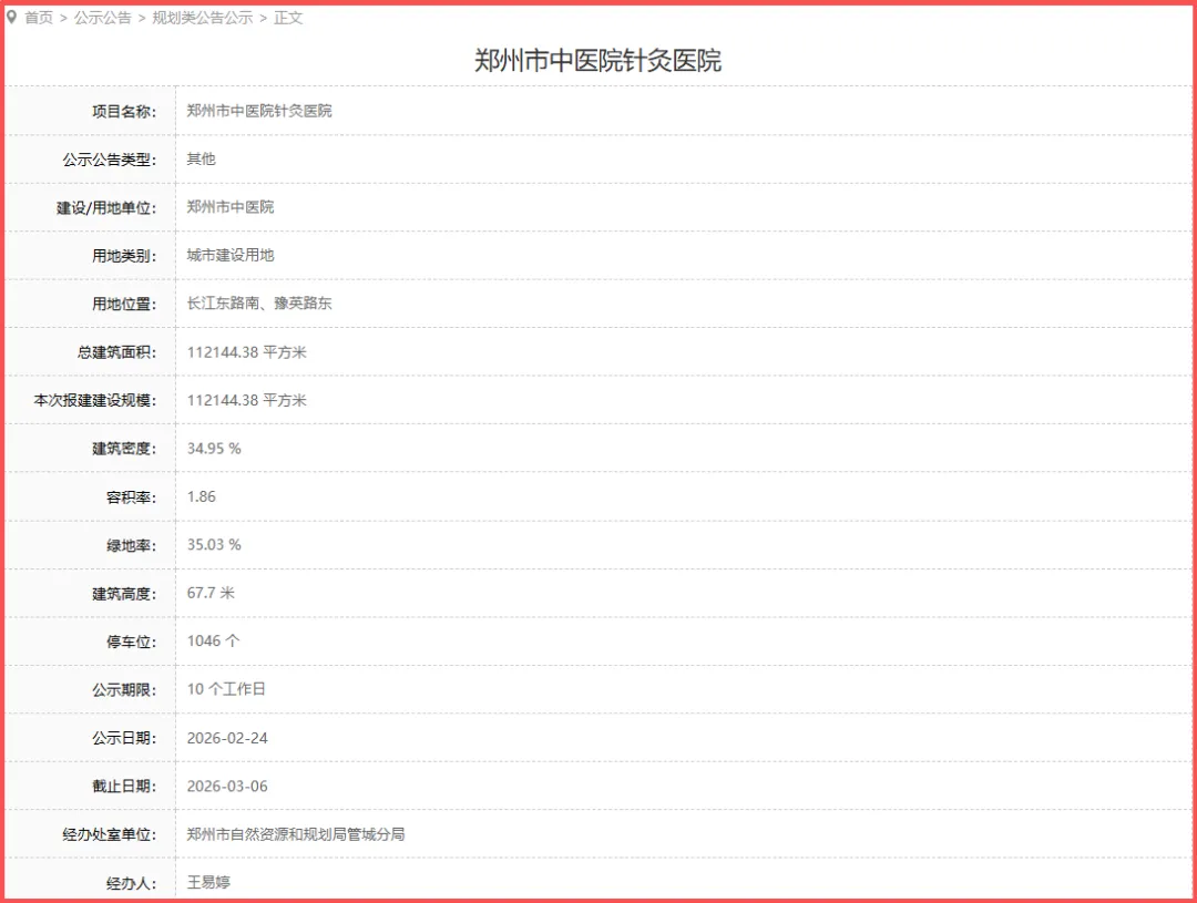 这一次的报建规模是11.2万平方米,建设单位则是郑州市中医院,停车位1046个。