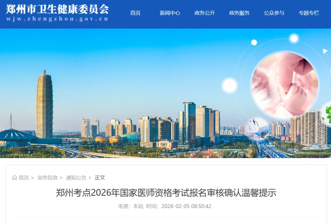 根据《国家卫生健康委员会医师资格考试委员会公告》(2026年第1号)要求,现将郑州考点2026年国家医师资格考试报名及审核工作有关事项温馨提示如下: