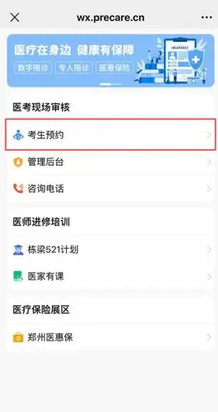考点复审合格考生本人取得2026年《医师资格考试报名暨授予医师资格申请表》(一式三份),核对信息无误签字后留存一份,关注微信服务号“豫康通”点击“本地服务”选择“考生预约”。具体操作见附件7。