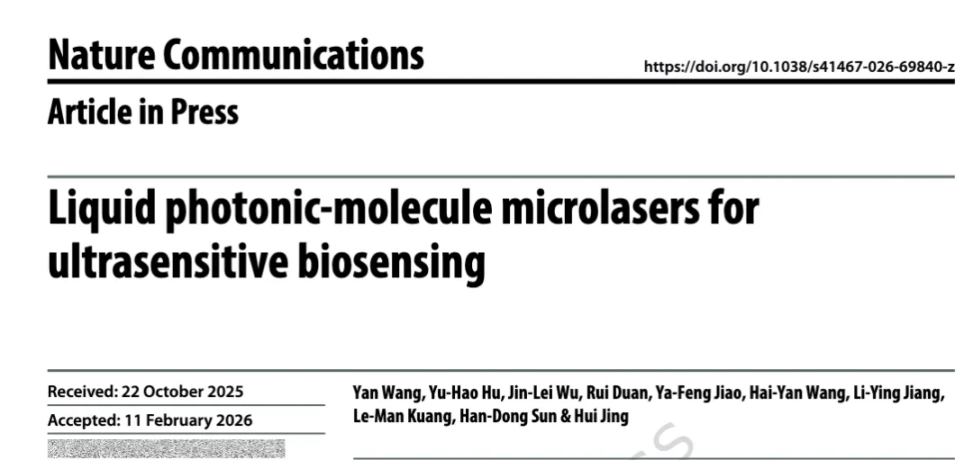由郑州轻工业大学、湖南师范大学牵头,联合郑州大学、四川大学、澳门大学等单位的研究团队完成的成果 “Liquid photonic-molecule microlasers for ultrasensitive biosensing” 近期被《Nature Communications》接收(接收日期 2025 年 10 月 22 日,录用日期 2026 年 2 月 11 日)。该团队首次实现基于耦合液滴微谐振器的液体光子分子(LPM)微激光器,攻克了传统回音壁模式(WGM)液滴微激光器激射阈值高、光谱纯度低、传感灵敏度有限的核心难题,实现了 610 nJ mm⁻² 的低阈值单模激射,光谱灵敏度较单液滴提升近 10 倍,生物分子检测限低至 30 aM,动态范围跨越 9 个数量级,为超灵敏无标记生物传感搭建了全新的光子学平台。