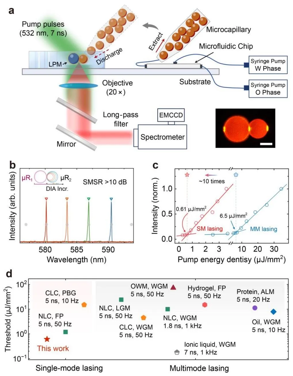 WGM 液滴微激光器因柔性可重构、对环境扰动高度敏感、具备无标记传感能力等优势,成为生物光子学和生物医学领域的研究热点,但其发展受限于两大核心问题:一是多模激射导致光谱纯度低,光谱响应对外部刺激的分散性严重制约传感灵敏度;二是高激射阈值易对生物样品造成光毒性和热损伤,难以满足活体长期监测需求。而光子分子通过耦合多个谐振器实现模式选择,是构建单模微激光器的有效手段,却因液体环境中难以实现液滴谐振器的稳定耦合和精准模式调控,迟迟未能在液滴体系中实现突破。针对这一痛点,研究团队创新性地将光子分子概念与液滴微激光器结合,设计了全新的 LPM 体系。