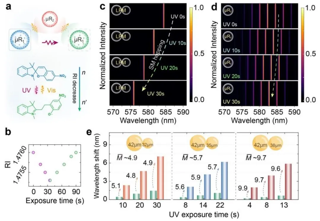 团队构建的 LPM 由两个尺寸失配的染料掺杂油滴构成,在水环境中通过倏逝场的空间强重叠实现光学耦合,核心利用光谱游标重叠效应压制冗余激射模式,仅保留双谐振器共谐振的单一模式,实现高纯度单模激射。实验中采用微流控芯片制备高均一性的单分散液滴,通过微毛细管精准转移并实现液滴的可控接触,形成稳定的 LPM;同时将光异构螺吡喃分子选择性掺杂入大液滴,利用紫外 / 可见光调控下的分子异构化反应,改变液滴有效折射率,打破原有模式匹配并重构游标重叠,实现 LPM 单模激射的动态可调谐与模式跳变,为灵敏度放大奠定基础。