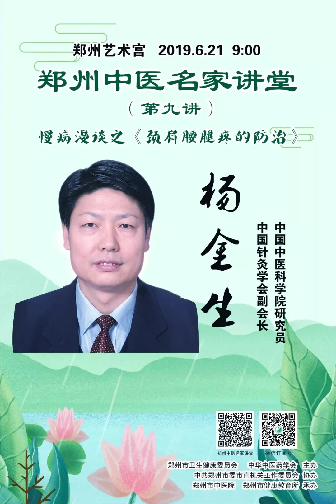 2019年第二期《郑州中医名家讲堂》将于6月21日盛大开讲,特邀中国中医科学院首席研究员、中国针灸学会副会长、国家中医药管理局对台港澳中医药交流合作中心主任杨金生教授,讲解《颈肩腰腿疼的防治》。