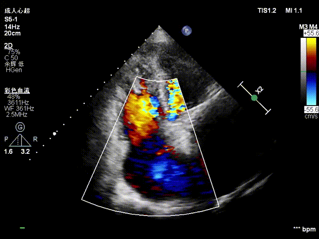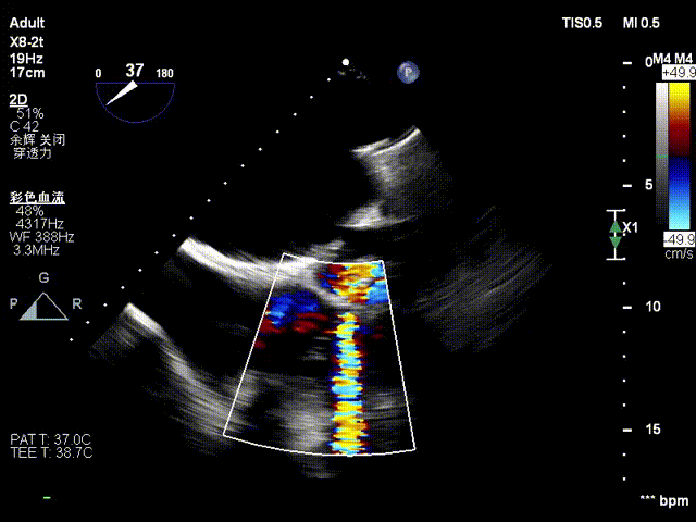超声心动图:三尖瓣瓣环显著扩张(平均径42mm),瓣叶对合不良,TR 4+;肺动脉收缩压 58mmHg;左心室射血分数(LVEF)54%;人工二尖瓣功能未见异常。