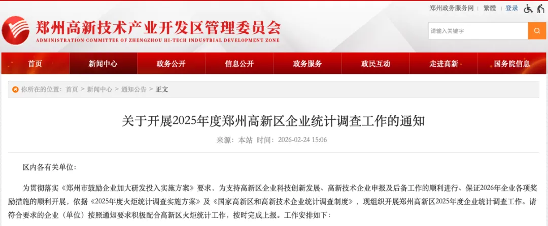为贯彻落实《郑州市鼓励企业加大研发投入实施方案》要求,为支持高新区企业科技创新发展、高新技术企业申报及后备工作的顺利进行、保证2026年企业各项奖励措施的顺利开展,依据《2025年度火炬统计调查实施方案》及《国家高新区和高新技术企业统计调查制度》,现组织开展郑州高新区2025年度企业统计调查工作。请符合要求的企业(单位)按照通知要求积极配合高新区火炬统计工作,按时完成上报。工作安排如下: