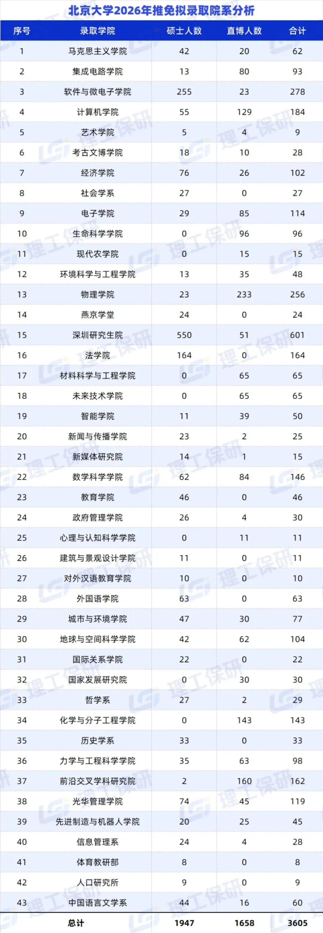 2026年北京大学共有43个院系招收推免生,深圳研究生院(601人)、软件与微电子学院(278人)、物理学院(256人)、计算机学院(184人)、法医院(164人)是招生数量最多的五个院系。