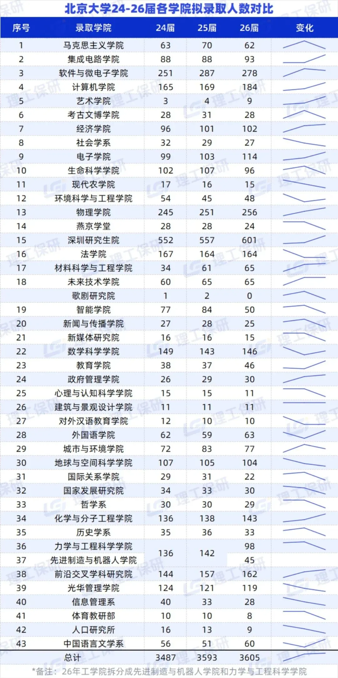 社会学系24届32人→25届29人→26届27人,招生人数持续减少;智能学院24届77人→25届84人→26届50人,后期大幅减少;光华管理学院24 届124人→25届121人→26届119人,招生人数持续减少。