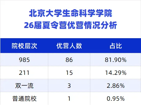 就夏令营优营情况,北京大学生命科学学院26届夏令营优营资格的获取与院校层次高度相关,985院校学生具有绝对优势,211院校学生有一定机会,而双一流和普通院校学生机会非常渺茫。