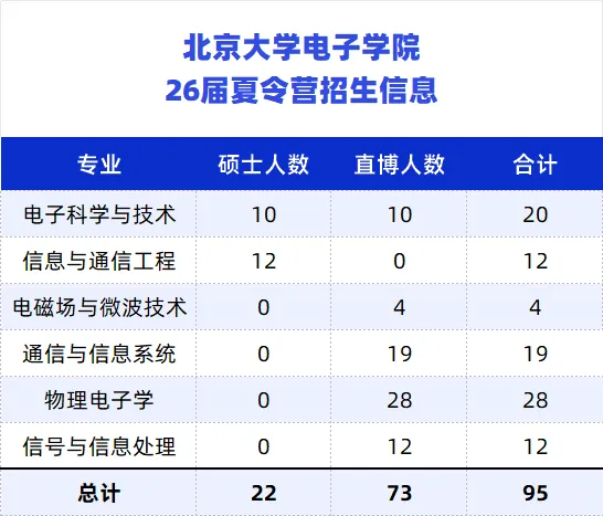 就夏令营招生情况,招收硕士较少,优营22人,招收直博较多,优营73人,占招生总数76.84%。其中硕士生仅招收电子科学与技术和信息与通信工程专业,博士生物理电子学、通信与信息系统招生人数较多。具体招生情况如下。