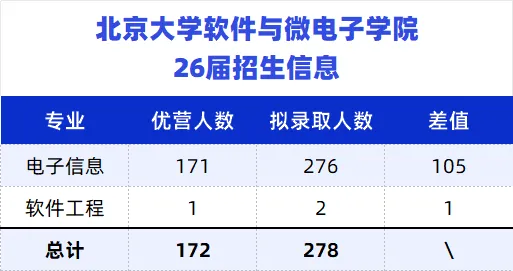 2025年,北大软微夏令营共172位同学获得优营。据2026年推免拟录取名单显示,北大软微共计在电子信息、软件工程两大专业多个方向招收278人,远超优营人数,其中硕士招收255人,占比91.73%,博士招收23人。