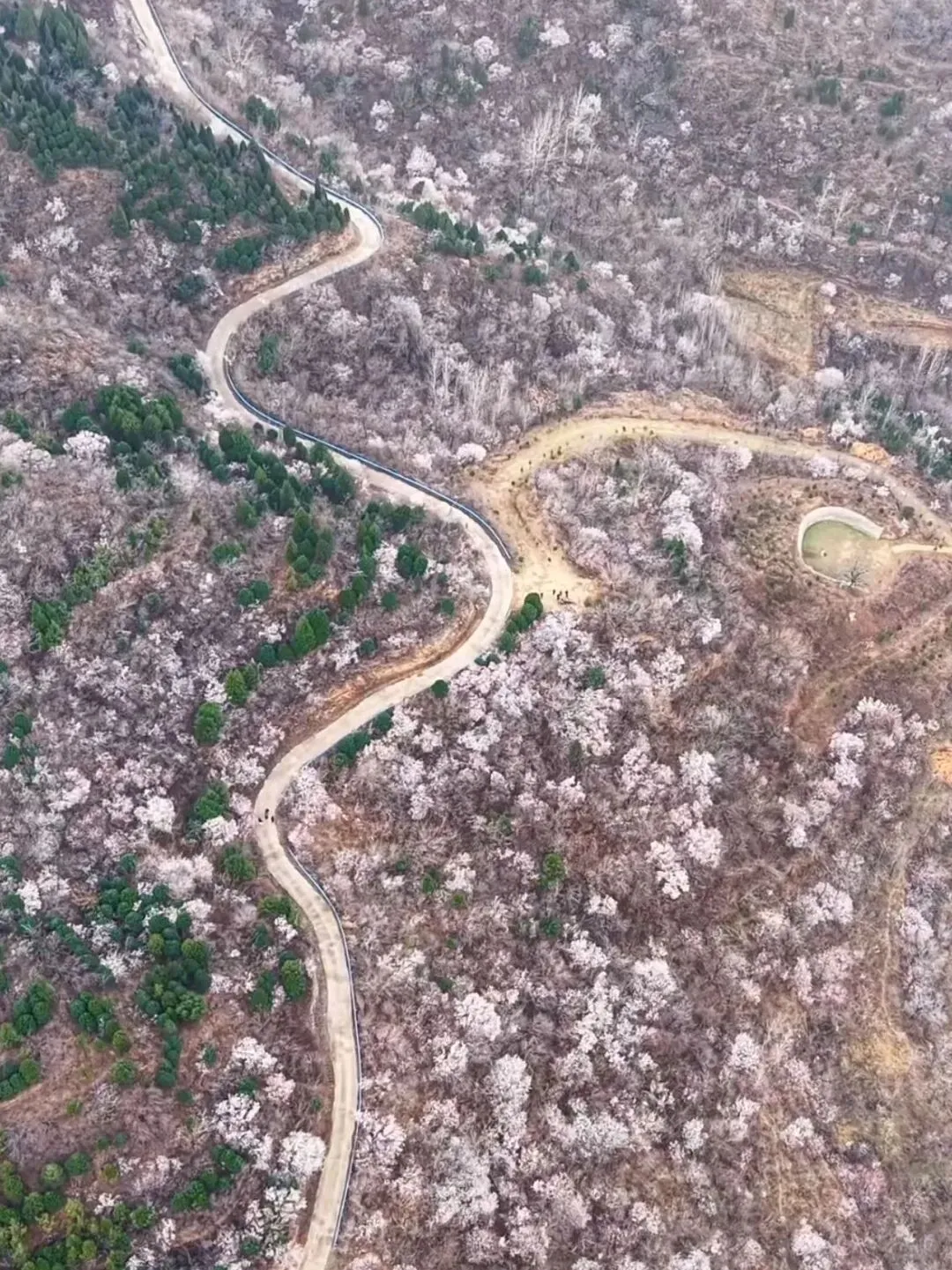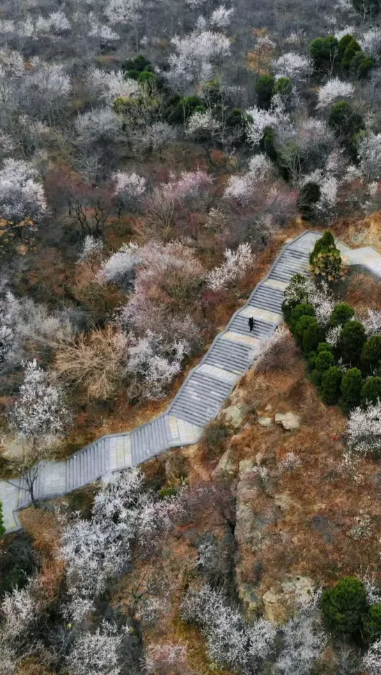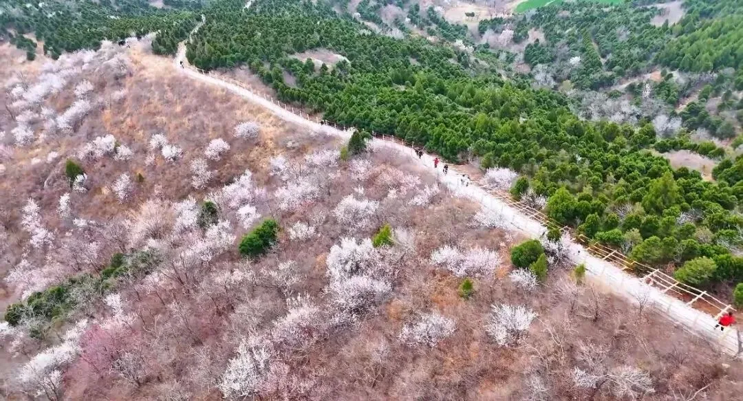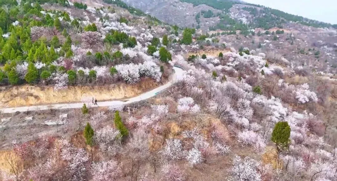 3月初,正是山花竞相绽放的最佳时节。野桃花与杏花交织,粉白相间,在苍翠山林间铺展成海。山风过处,花瓣如雨,恍若仙境。