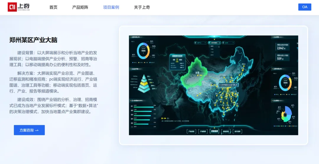 郑州高新区产业大脑建设由上奇自主研发的“产业知识计算引擎”提供核心技术支撑。2024年,平台全面建成“三端两库一引擎”体系,汇聚超2亿条原始数据构建产业数据底座,通过“产业数据底库、数字治理引擎、产业时空地图”三大核心板块,实现要素数据“上链”、治理服务“上屏”、供需匹配“上图”的数字化治理闭环。目前,郑州高新区产业大脑已形成覆盖智能传感器、超硬材料等9大重点产业链的动态知识图谱,为精准治理与企业服务奠定了坚实基础。平台建成以来,高新区新增企业2.6万家,新增融资项目25个、披露融资金额超13亿元;依托DeepSeek打造的AI政策通智能问答系统,服务超6000家用户,累计使用量突破10万次。
