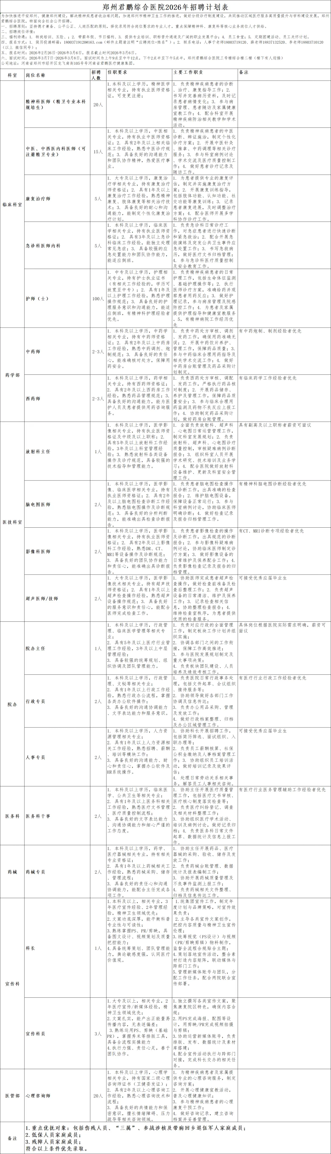 为加快推进平安郑州、健康郑州建设,解决精神类患者收治难的问题,加速推进郑州市精神卫生工作建设,落实分级诊疗制度,共同推动区域精神卫生医疗服务质量提升与学科建设发展。郑州君鹏综合医院作为郑州市精神卫生及郑州市第八人民医院医业务承载单位,将面向全社会公开招聘精神卫生方面专业技术人员。