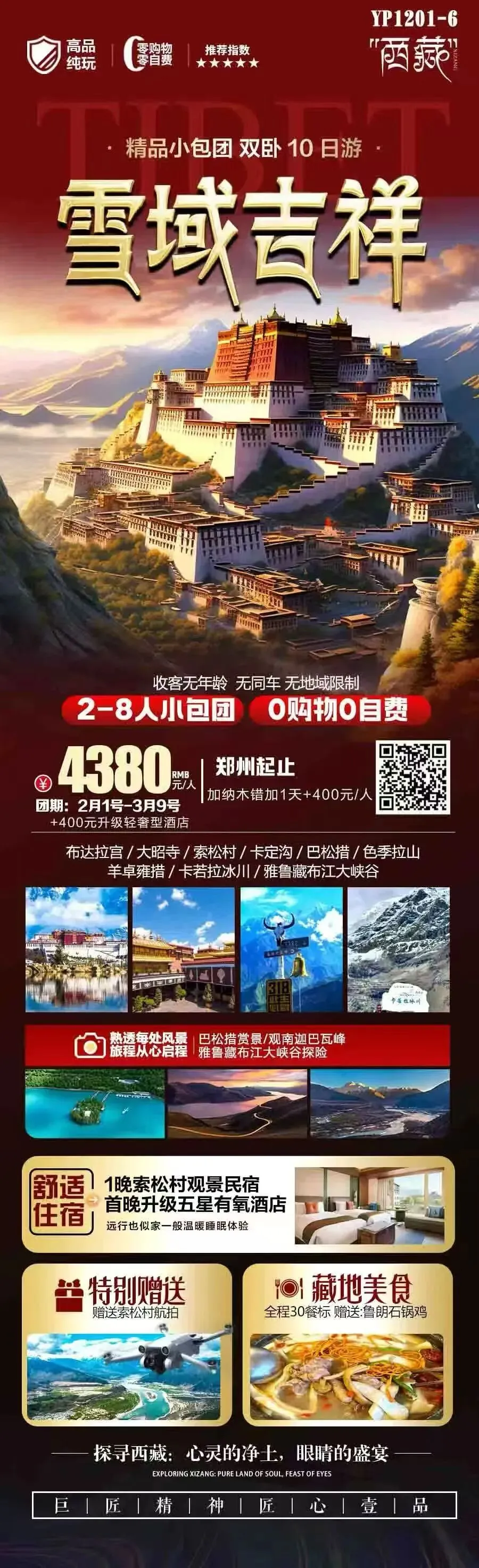 【接待标准】:1.【大交通】:往返郑州-拉萨或郑州-西宁/兰州-拉萨联程火车硬卧(火车上餐自理);火车票要求实名制,只保证有票,不保证铺位。具体车次以出团通知为准,确认以后如出票,客人取消只退未产生并扣除手续费的票面金额。2.【用车标准】:拉萨机场/拉萨火车站拼车接送,非专车接送,偶尔会有等待,如需包车接送,费用需自理。行程中西藏旅游用车5-15座,保证一人一正座、不保证空座率!西藏车辆资源受地区经济所限,车况、车型差,请作好心理准备!下林芝时游客需将大件行李箱寄存在拉萨酒店,携带软包(洗漱及更换衣物必备品)谢谢理解!3.【用餐标准】:6早6正,早餐为酒店赠送,不用不退。正餐30元/正,不含酒水(含1次特色餐:林芝石锅鸡)提示:如出发时间早,则由酒店提供路早(鸡蛋、馒头、点心等之类),由于西藏特殊地区物价较高,多以川菜为主,团餐餐饮环境及质量有限,整个行程行驶距离远,车程时间长,建议提前准备点心、水果等之类。4.【门票标准】:冬游政策西藏除寺庙外,其他A级景区免门票,此行程只含寺庙+观光车,其他景区不含门票。5.【住宿标准】:当地携程三钻标准酒店(如单人入住,需补房差)+1晚索松村民宿,首晚升级一晚准五有氧酒店。如需其它房型,价格另议。不提供自然单间,单数参团只能提供加床或包房(加床一般为钢丝床或床垫)6.【导服标准】:司机服务,本团无导游,只有司机服务,食宿由旅行社承担。为了首要保证行车安全,司机无法提供讲解,请各位拼友也可以自行提前做游玩攻略。