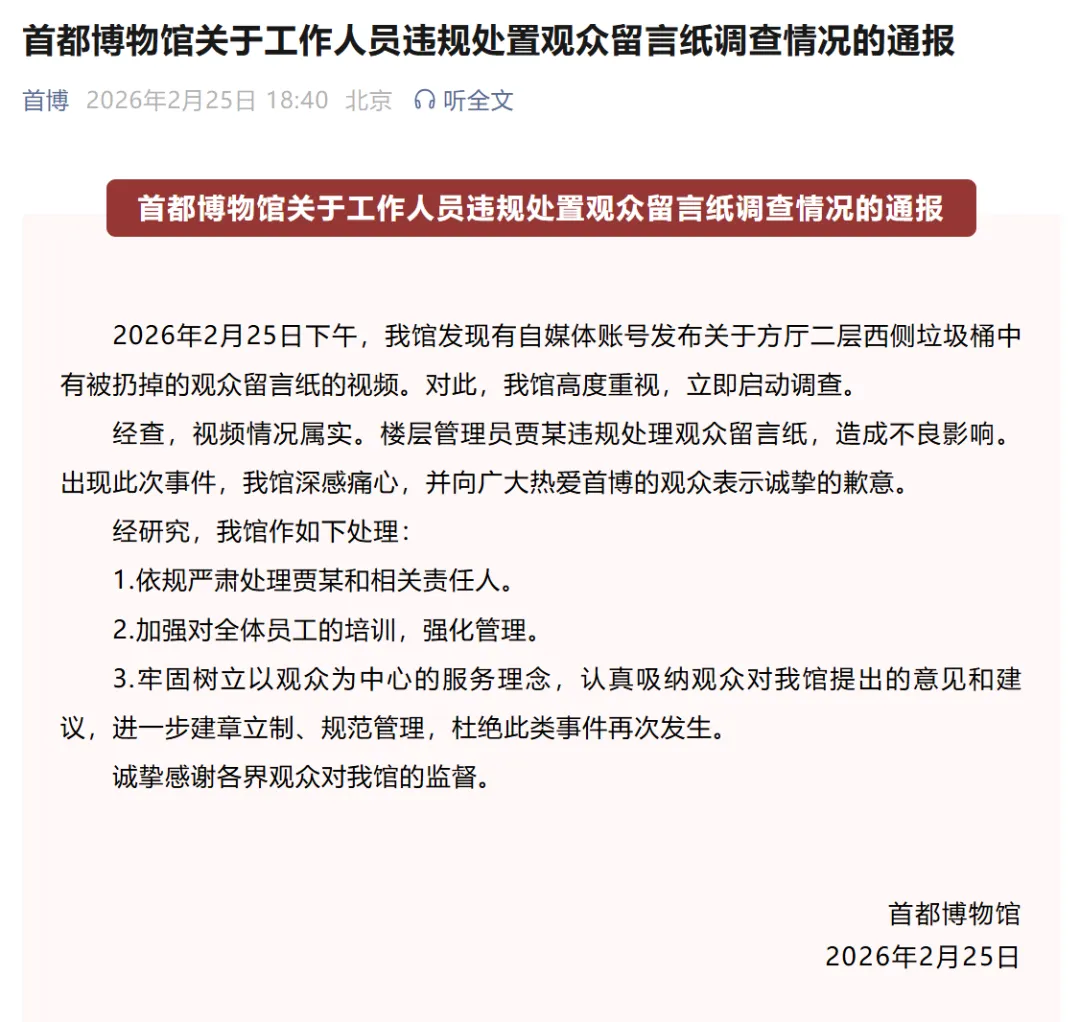 ●官方通报“首都博物馆观众留言当天就被丢进垃圾桶”:情况属实,依规严肃处理贾某和相关责任人。