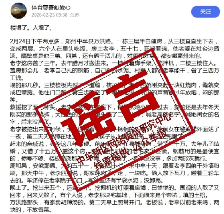 ●25日9时30分,网络账号“体育慈善献爱心”发布图文信息称“2月24日下午两点多,郑州中牟县万洪路一栋三层半自建房倒塌,多人被埋”等内容。经核查,该信息为网络谣言,相关内容纯属虚构。