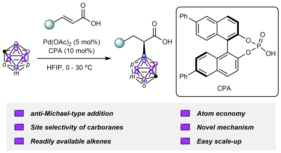 相关成果以“Palladium-catalysed asymmetric antiMichael-type addition ofα,β-unsaturated carboxylic acids with carboranes”为题发表在国际权威期刊《Nature Catalysis》上。