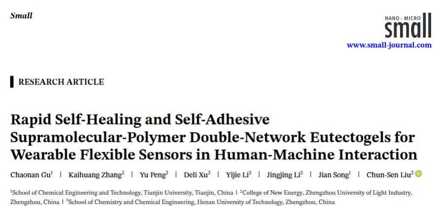 天津大学宋健教授/郑州轻工业大学刘春森教授团队《Small》近期成果:超分子-聚合物双网络低共熔凝胶,赋能穿戴式人机交互传感器