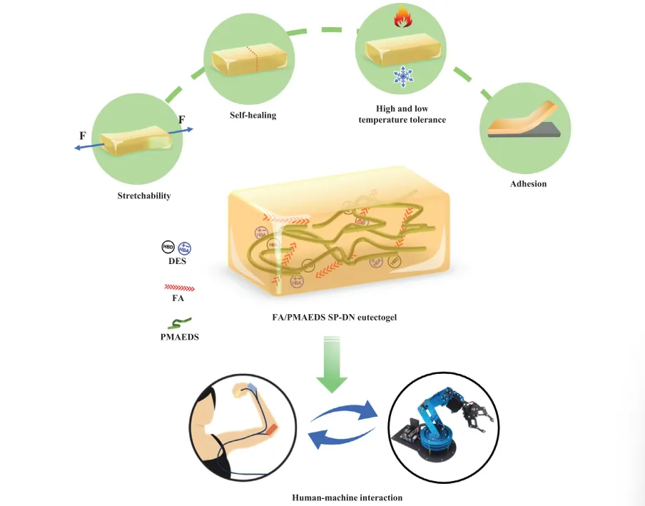 针对这一痛点,天津大学宋健教授与郑州轻工业大学刘春森教授团队提出超分子-聚合物双网络(SP-DN)设计策略,研发出叶酸(FA)/聚[2-(甲基丙烯酰氧基)乙基]二乙基-(3-磺丙基)铵盐(PMAEDS)低共熔凝胶。该凝胶以深共熔溶剂(DES)为分散介质,集成快速自修复、强粘附、宽温域耐受等多功能特性,为高性能穿戴式传感器提供全新材料方案。